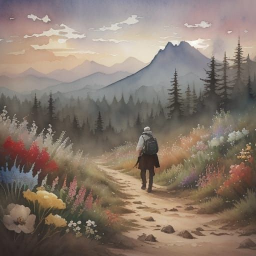 A wistful watercolor scene of a wanderer walking through a wilted woodland, surrounded by wasted beauty and whimsical flowers.