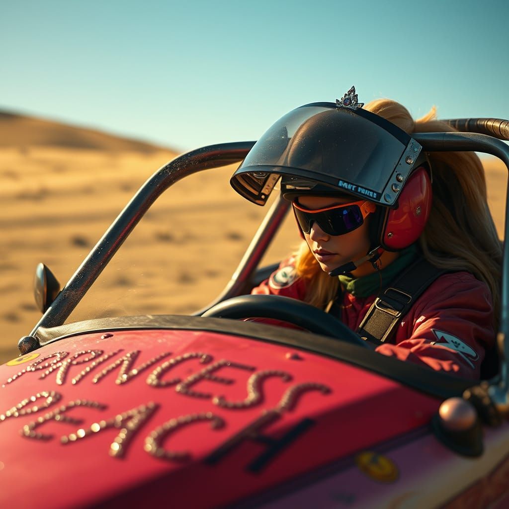 This image shows Princess Peach in a gritty, dystopian race. Peach is wearing road leathers and driving a dune buggy with 'PRINCESS PEACH' written on the hood as HDR photography.
