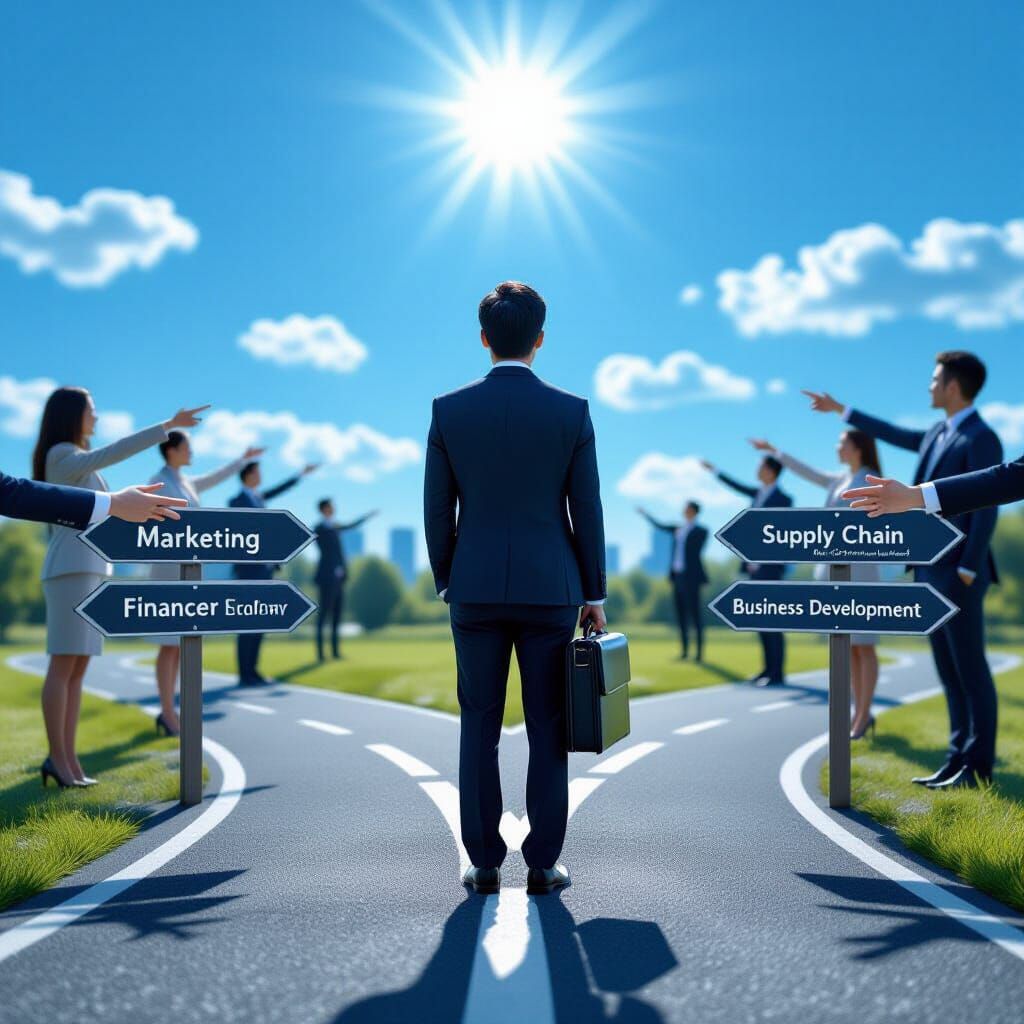 This image shows a young Asian graduate in a suit at a symbolic crossroads, with paths like Marketing and Finance. Supportive hands and blurred faces highlight career growth in a cinematic corporate style.