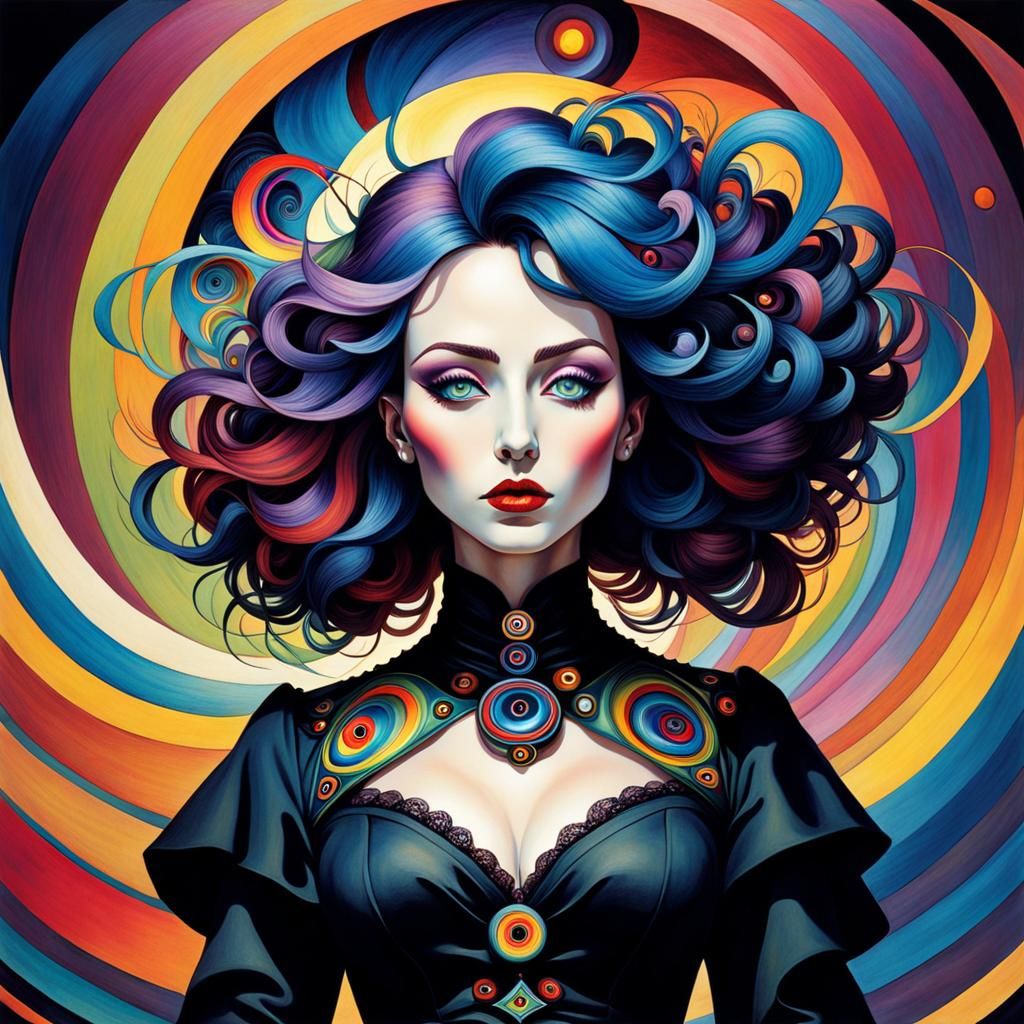 Sensual woman. Kandinsky, Tim Burton and Jean-Baptiste Monge fantasy psychedelic intricate colorful magic realism surreal weird crazy detail hypnosis vivid hallucination kaleidoscope Unique puzzling swirls of color