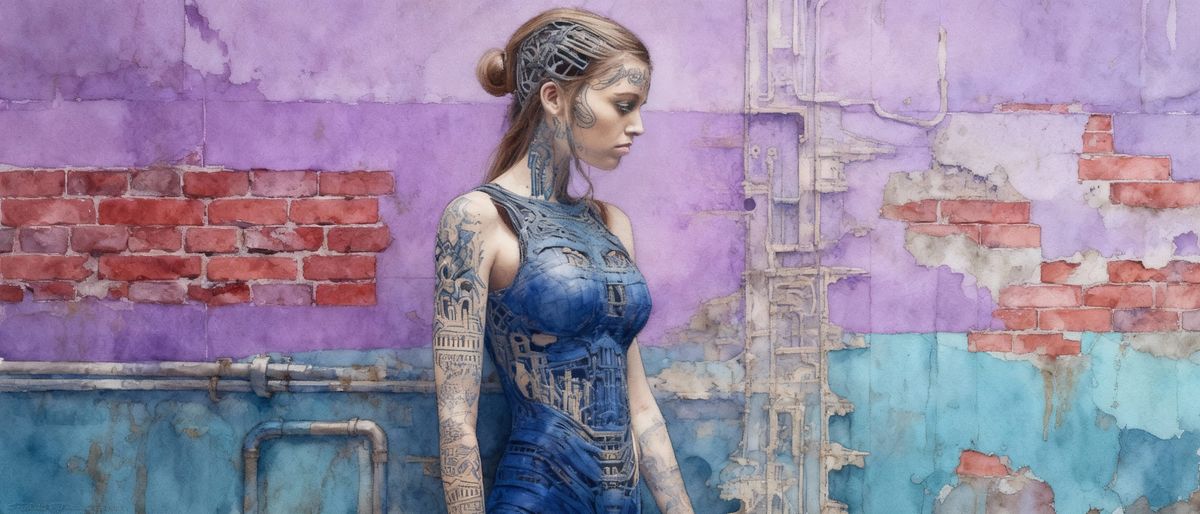 A full-palette water-colour quarter profile of a cyborg woman (ultramarine/navy blue gradient post-apocalyptic cityscape-pattern dress; ancient Babylonian cityscape pattern tattoos; somber expression), standing against a wall of alternating mauve/brick-red stonework-and-piping and faded ultramarine/teal ...