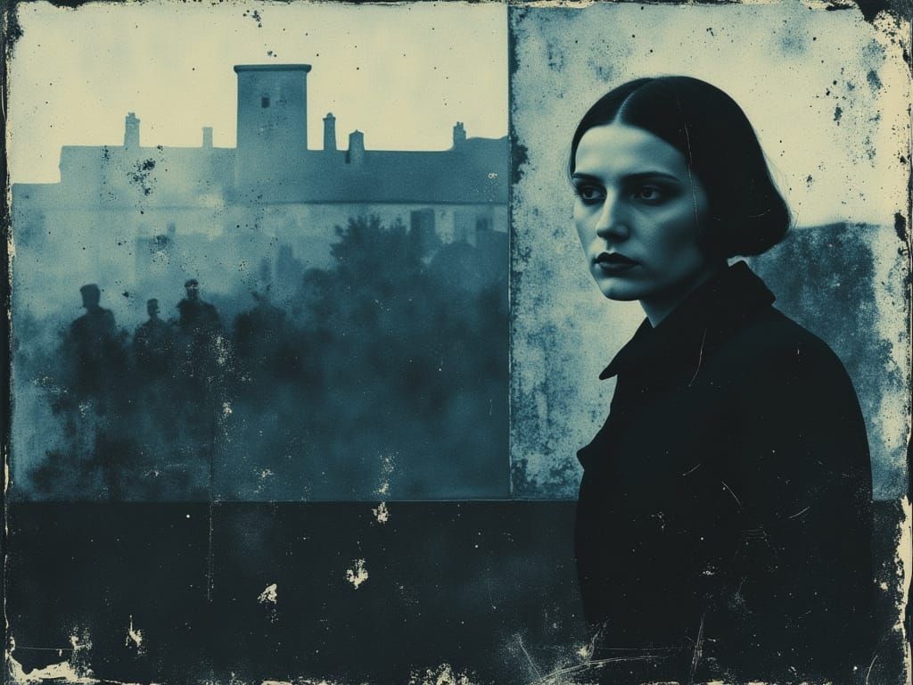 This image depicts a layered, double-exposure artwork of war scenes over a French village. It features somber blues, greys, and sepia tones, with a spotlight effect, evoking grief and healing in a surrealist style.