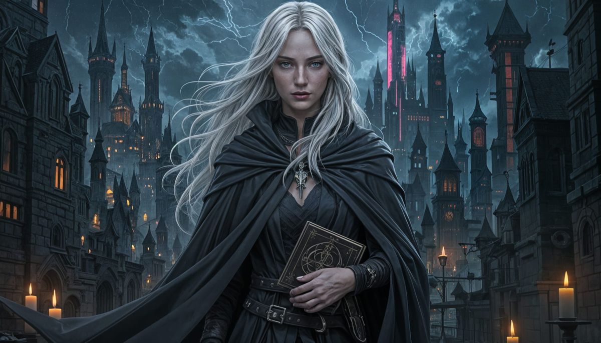 This image shows a hyperrealistic portrait of a sorceress in a fractured landscape. She is draped in flowing cloaks, with silvery hair and amber eyes, set against a backdrop of ancient streets and neon towers.