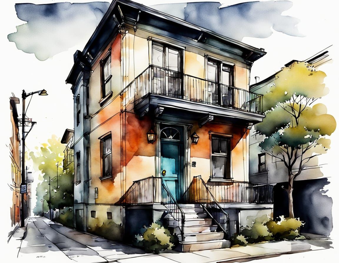 Easily create your own urban townhouse images with our free AI image generator, featuring ink and watercolor styles