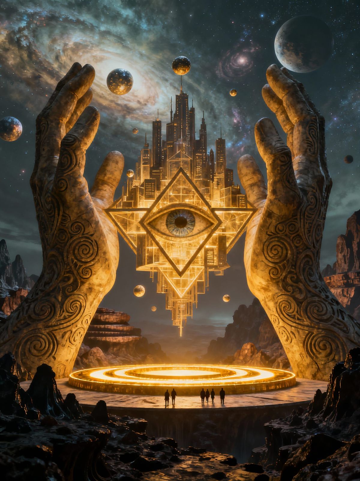 This image shows immense, carved hands supporting a glowing geometric city. Dramatic lighting and a surreal, otherworldly landscape with nebulae create a sense of grand scale and mystery. Digital art with high detail.