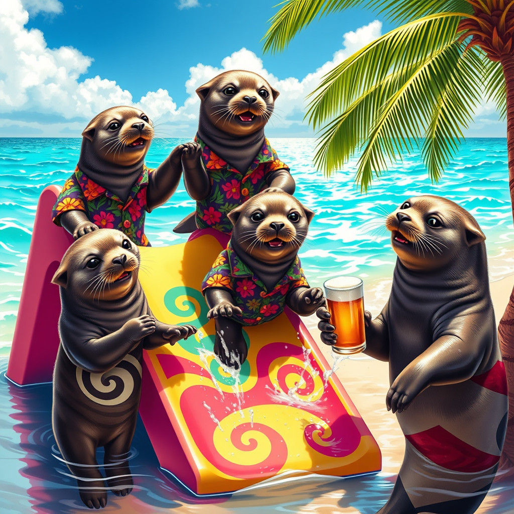 This image shows tiny sea lions having a party on a tropical beach. The sea lions are wearing floral Hawaiian shirts and are playing on a small water slide in a whimsical, fantastical style.
