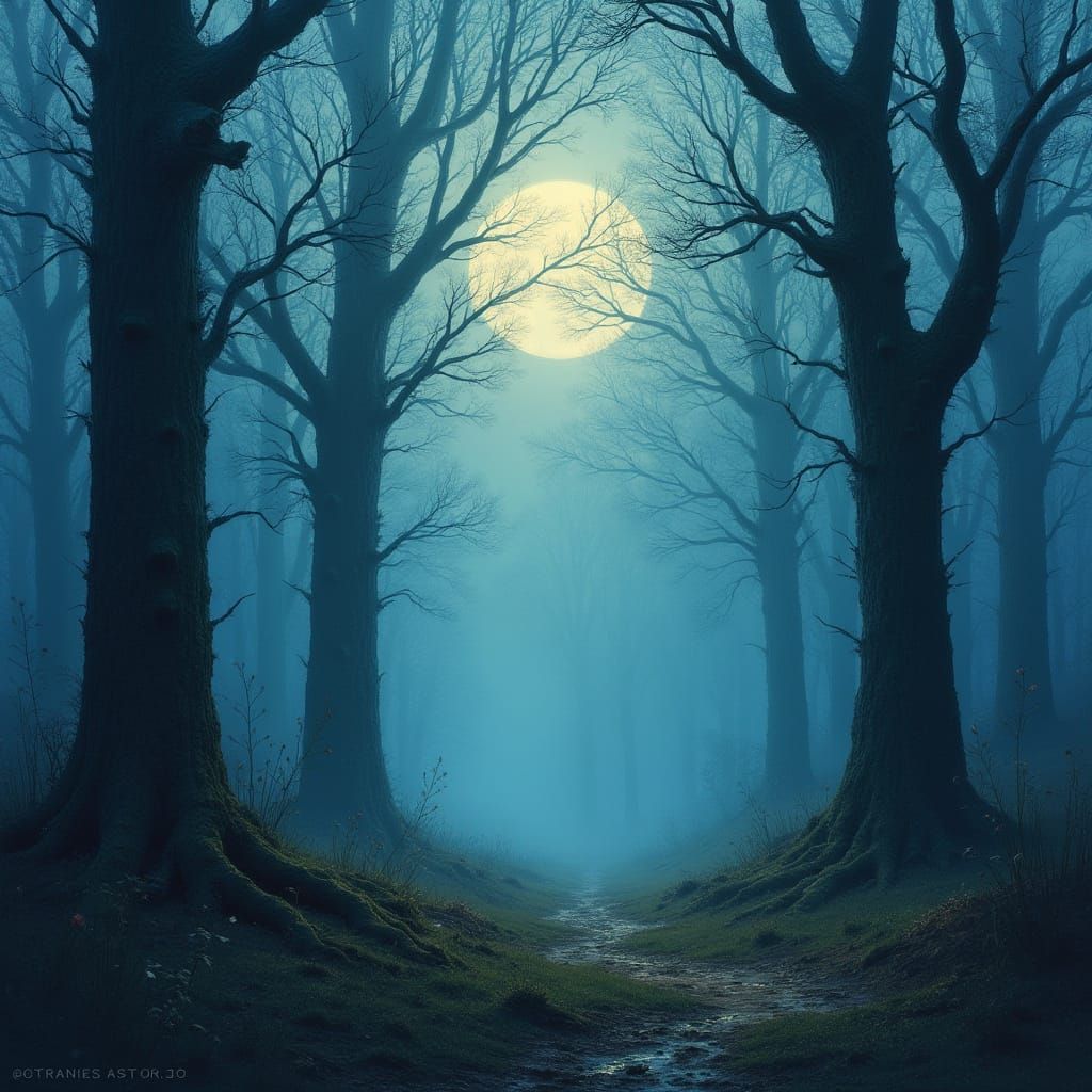This image depicts a mystical forest illuminated by soft moonlight, featuring towering trees with gnarled branches and intricate patterns, blending traditional and digital media in a dreamlike quality reminiscent of atmospheric landscapes and mystical art