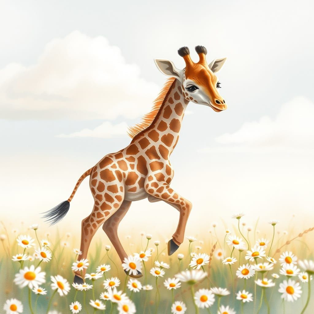 A charming image of a baby giraffe with pastel spots playing in a daisy field under a cloudy sky. The artwork is reminiscent of watercolor art with soft pastel colors.