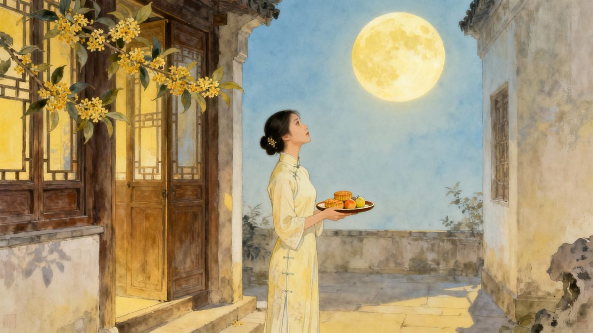 A serene image captures the Mid Autumn Festival tradition with a full moon and a woman paying respects to it under a clear night sky.
