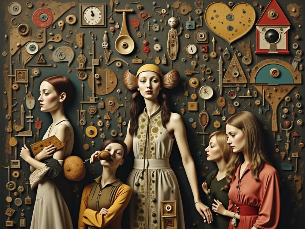 This image shows scenes inspired by the song Eleanor Rigby. It features dark colors and collage elements, depicting the loneliness and isolation described in the lyrics.