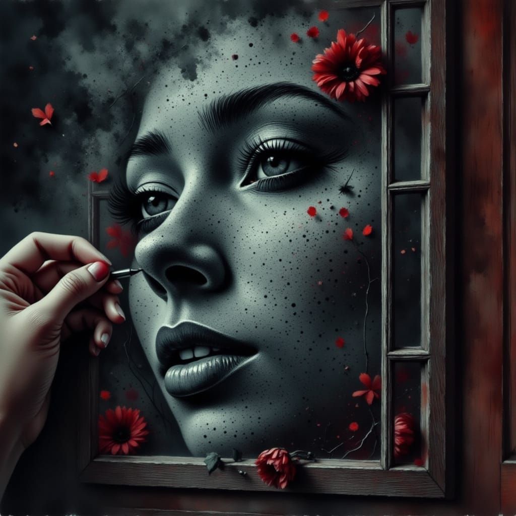 This image shows a pencil sketch of a hand drawing a woman singing on paper. The surreal image seems to rise from the page beside an open window, in a vintage style.