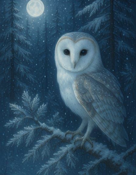 This image shows a barn owl in a moonlit pine forest during winter. The owl's feathers glow with ghostly light as snow falls softly on the frost-tipped evergreen branches.