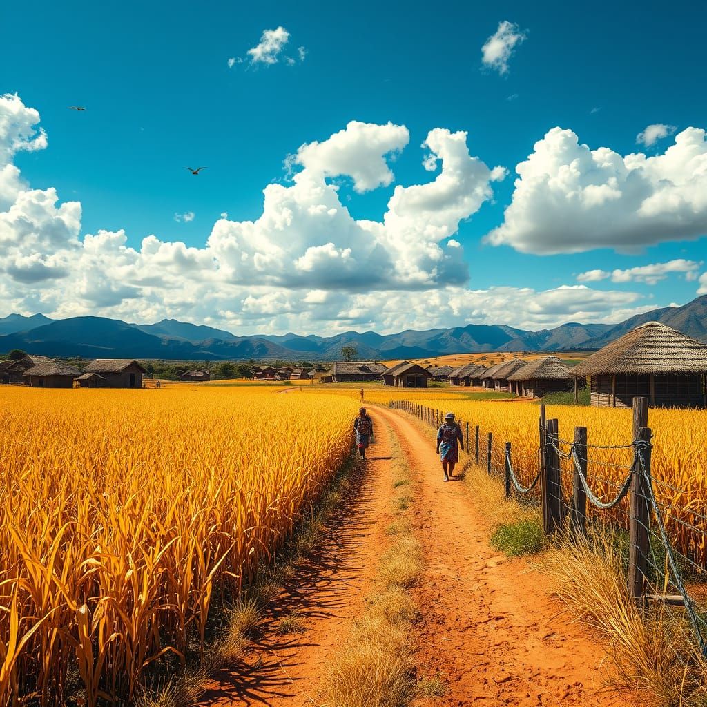 This image captures a serene rural landscape in South Africa, with a vast corn field stretching across the village, traditional huts, and rolling hills, set against a brilliant azure sky with fluffy clouds and warm afternoon light.