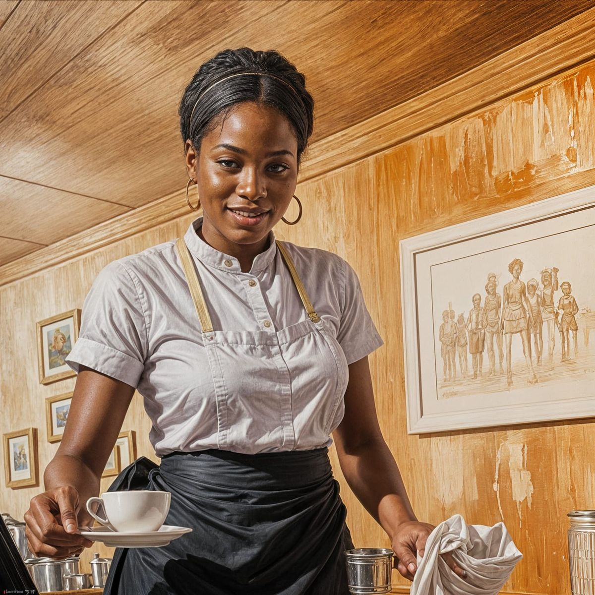 This image shows an African waitress in a classic portrait. The artwork evokes a traditional fine art style with painterly qualities and rich, warm tones.