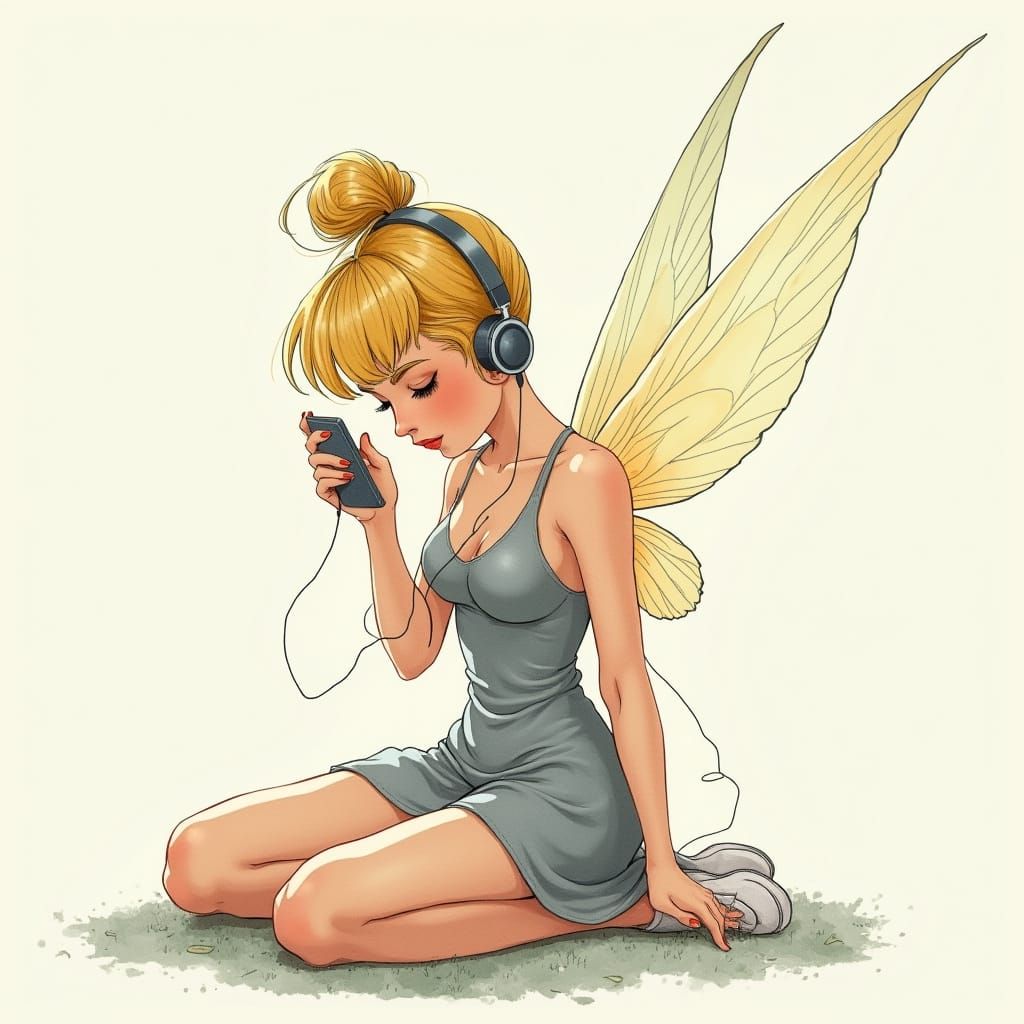This image depicts a modern, curvy teen Tinkerbell in a grey dress, listening to music on her smartphone with earphones. Rendered in a simple ink drawing style with watercolor touches, reminiscent of Art Nouveau.