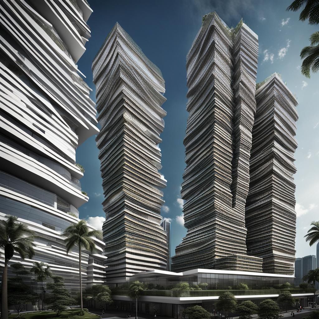 A hyperrealistic image of a corporate skyscraper in Kuala Lumpur. The building blends deconstructivist architecture with biophilic design and Balinese Legong dance motifs, rendered as a detailed matte painting.