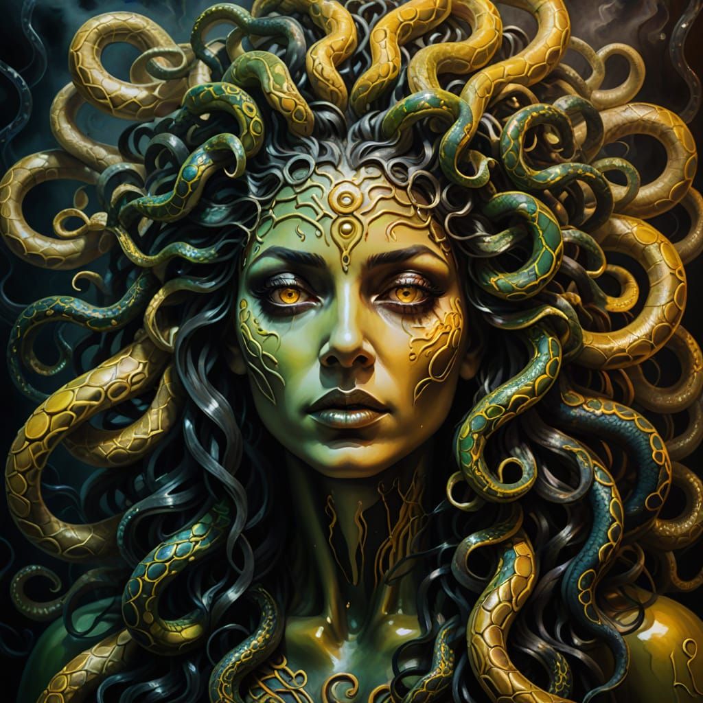 A surreal portrait of Medusa with a gentle face. The vibrant oil painting features triadic colors and glossy snakes. Smoke rises from her hair in golden hour lighting, in a noir, dark academia style.