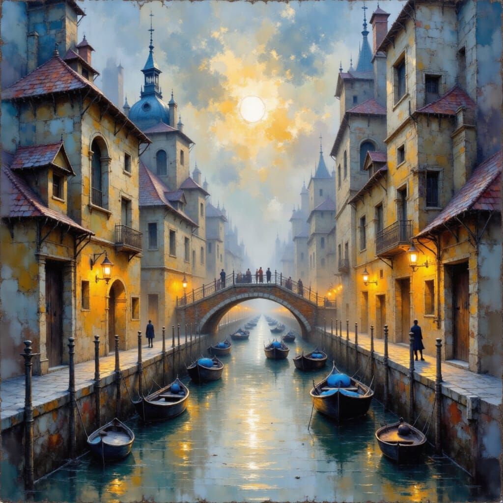 A beautiful oil painting of Venice at night, with rustic stone walls, fairytale boats, and breathtaking moonlight. The detailed artwork features textured brushstrokes and rough paint effects, capturing the city's romantic atmosphere with dramatic light and metallic sheen.