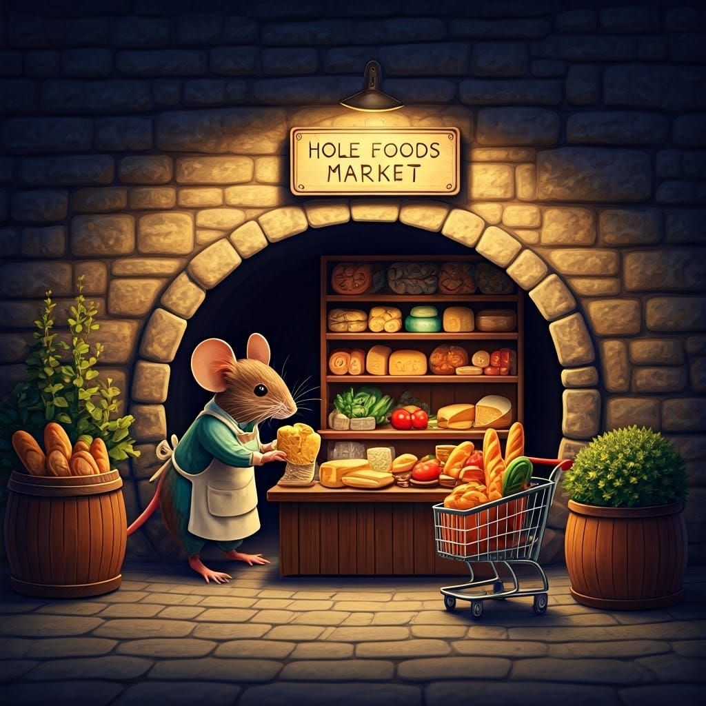 A charming mouse market clerk serves a customer in a cozy English village-inspired setting, surrounded by fresh produce, artisanal cheeses, and crusty breads, reminiscent of classic children's literature