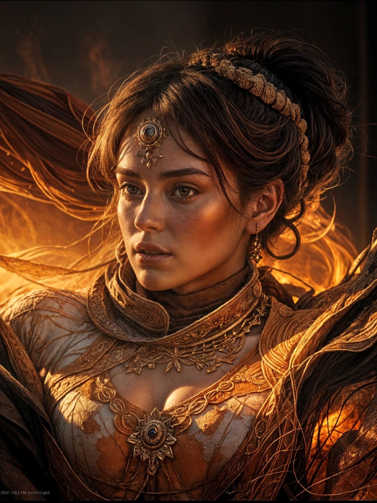A vibrant, high-resolution image of a warrior princess prepared for battle. The scene features dynamic and volumetric lighting, with intricate details and a rich color palette of orange, red, and yellow tones.