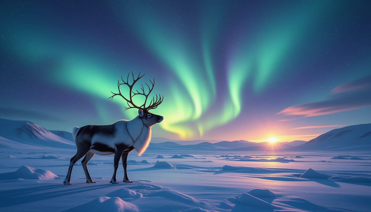 This image shows a hyperrealistic reindeer on a frozen tundra beneath vibrant, swirling auroras. Ethereal, cinematic lighting enhances the dramatic, wondrous scene.