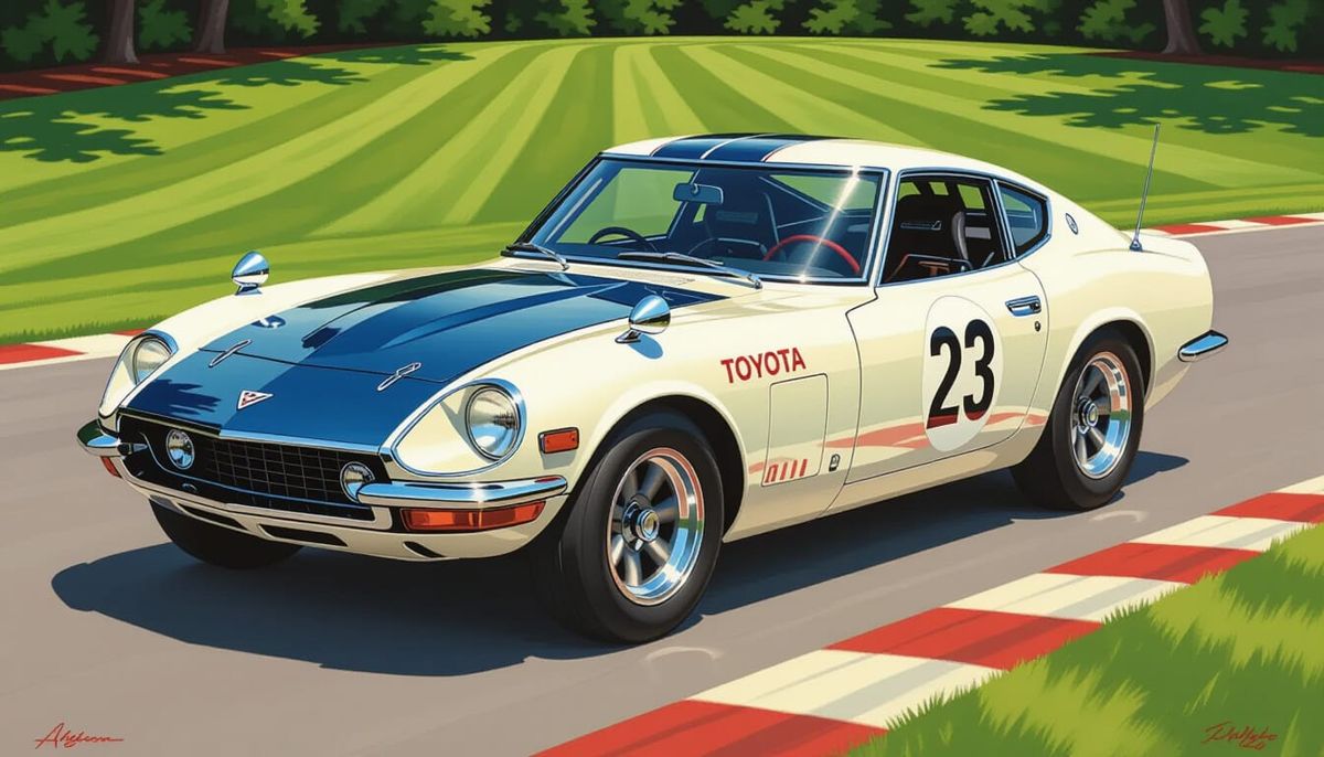 This hyperrealistic painting captures the 1967 Shelby Toyota 2000GT race car in ivory white with a dark blue hood. Rendered with dramatic lighting and intricate detail, it showcases the car's elegant design.
