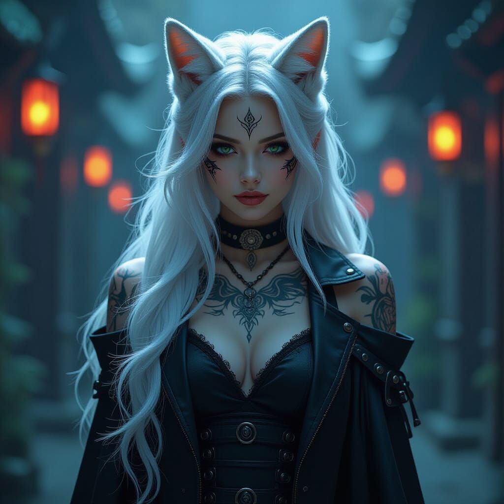 This image shows a fox-girl with mystical tattoos and flowing white hair, in a dark, avant-garde outfit. The image evokes a cyberpunk aesthetic with dark fantasy elements.