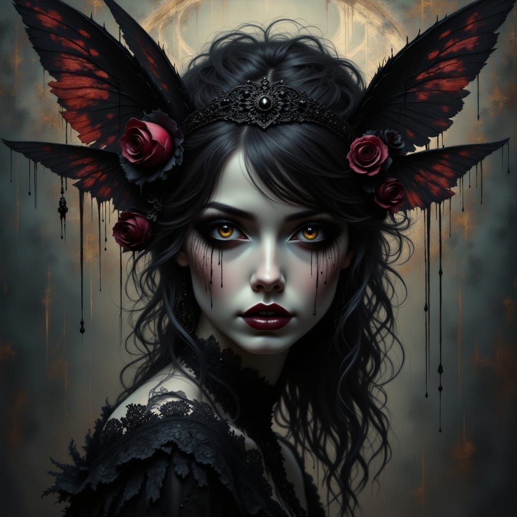 This image shows a deadly fairy in a captivating portrait. The artwork features intricate detail, dramatic lighting, and somber tones, reminiscent of romantic goth and macabre art.