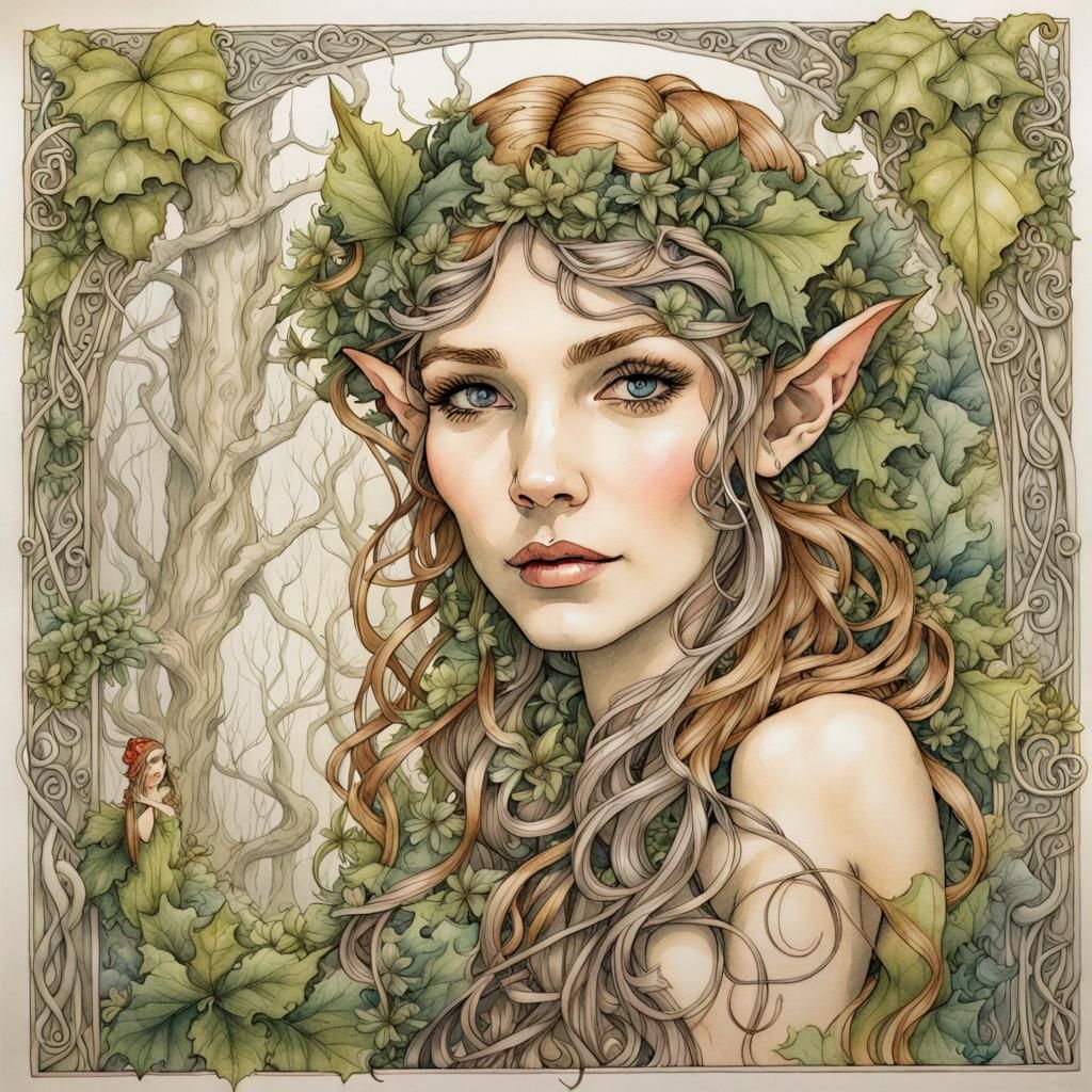 A striking picture of an elf portrait set in an enchanted forest. The artwork features intricate details and is framed by delicate vines in an art nouveau style.