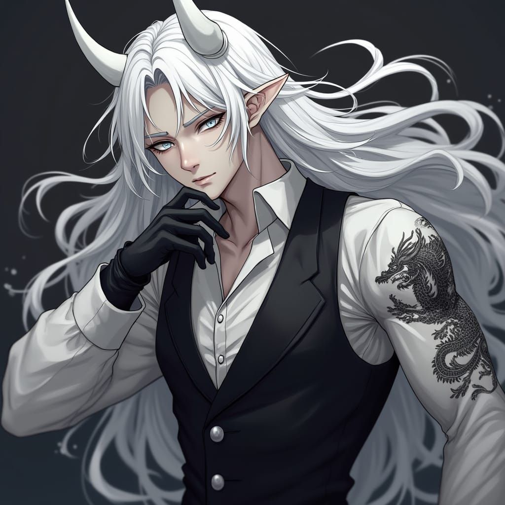 A gothic image of a vampire boy with horns, pointed ears, and pale skin. He wears a mafia-style vest and gloves, revealing a muscular build and a dragon tattoo.