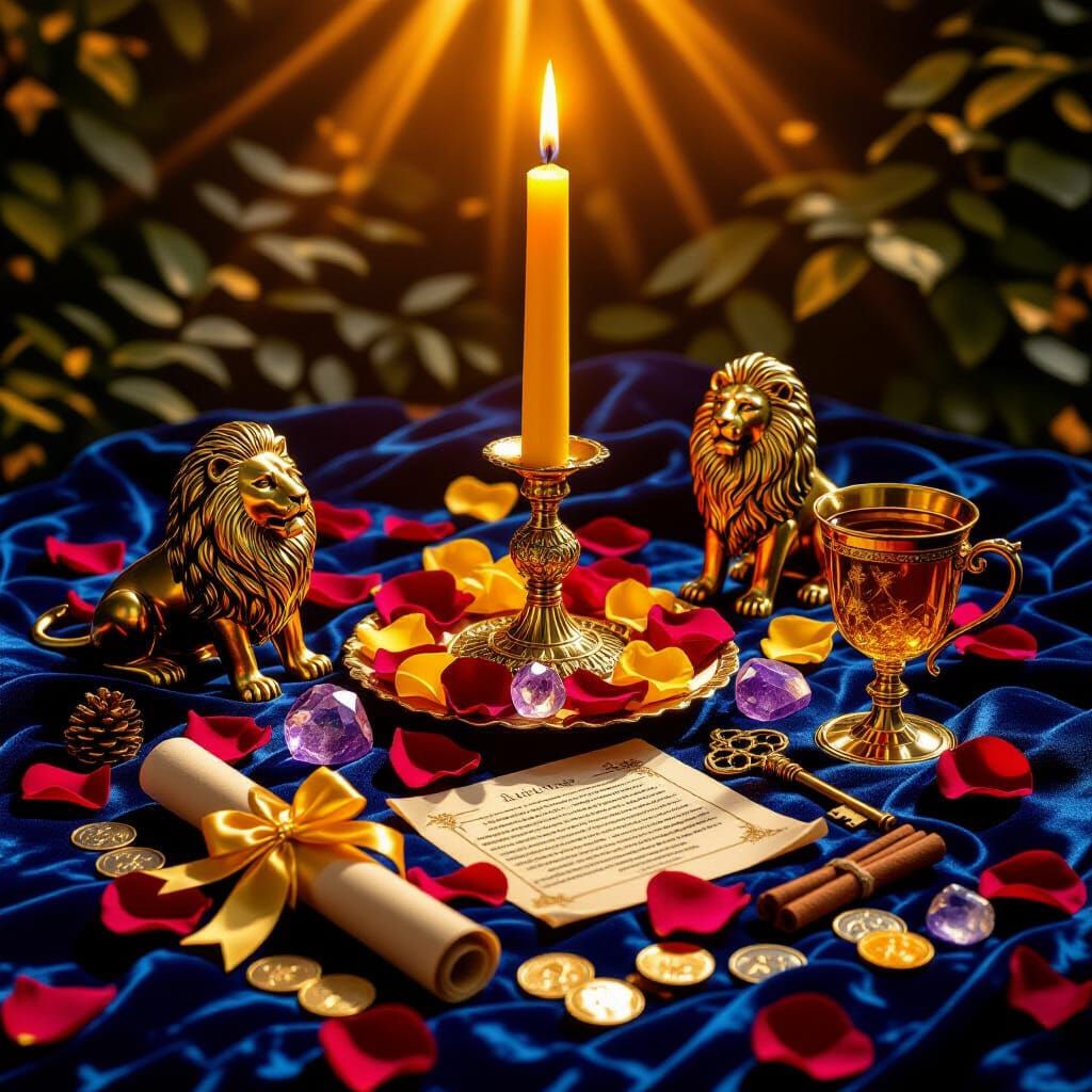 This image shows a Lions Gate altar bathed in golden sunlight. Rich colors and symbolic details create an ethereal scene, featuring scattered rose petals, crystals, and sun symbols.