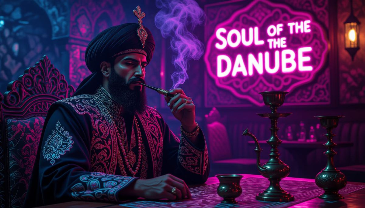 This image shows a heavily armored soldier smoking a hookah in a cyberpunk bar. Turkish patterns and neon text adorn the scene, which is awash in pink, purple, and cyan, in an art deco style.
