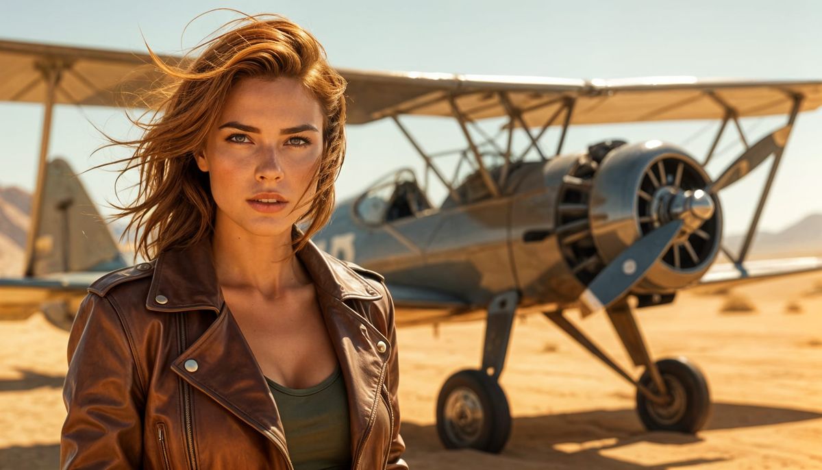 This image shows a confident woman with auburn hair standing by a biplane in a sunlit desert. She wears a leather aviator jacket, set against an Art Deco gas station in cinematic light.
