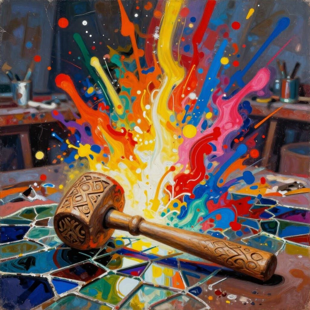 This image captures abstract energy with vibrant colors and light. A carved wooden mallet sits on shattered stained glass, evoking intense creative force in a Fauvist and abstract expressionist style.