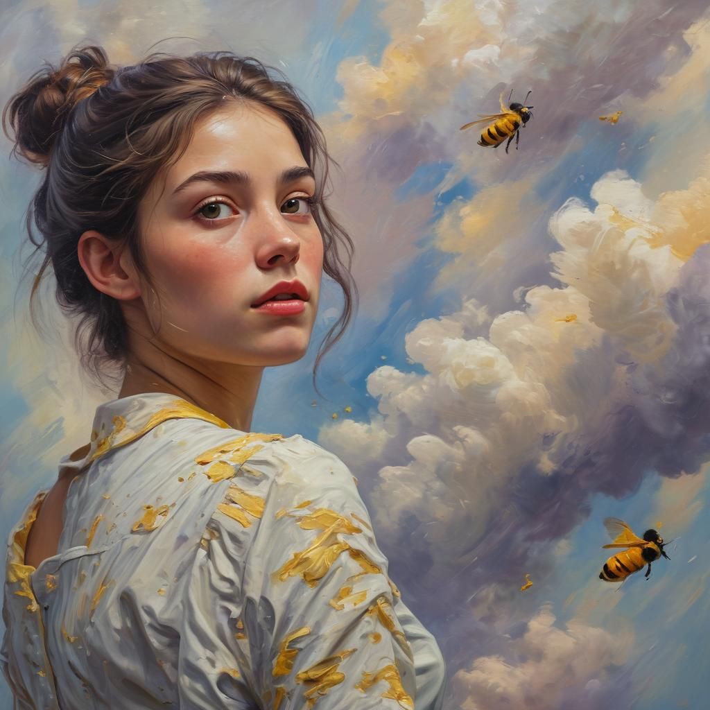 A striking picture of a determined young woman gazing upwards amidst swirling clouds of color. This neo-impressionist painting employs expressive brushstrokes and thick impasto layers in vibrant, glowing colors.