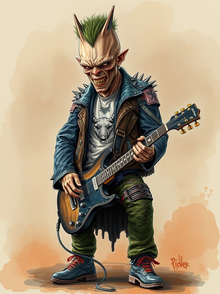 A striking picture of a wurstel metalhead playing guitar in a post-apocalyptic world. This comic book style watercolor artwork features deep colors and intricate details.