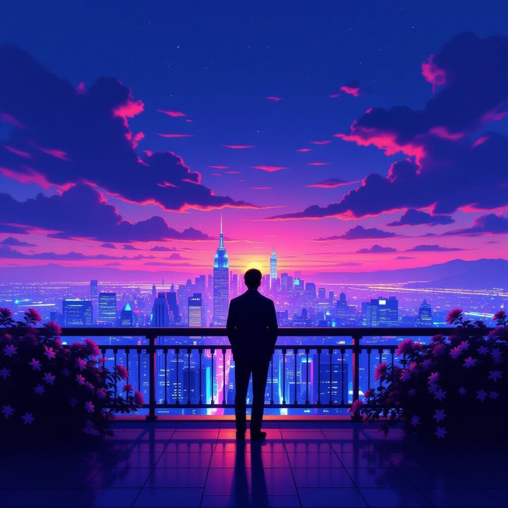 This image shows a lone figure on a balcony at dusk, silhouetted against a vibrant, neon-lit cityscape. The digital art features hyperrealistic detail with a painterly effect and cinematic lighting.