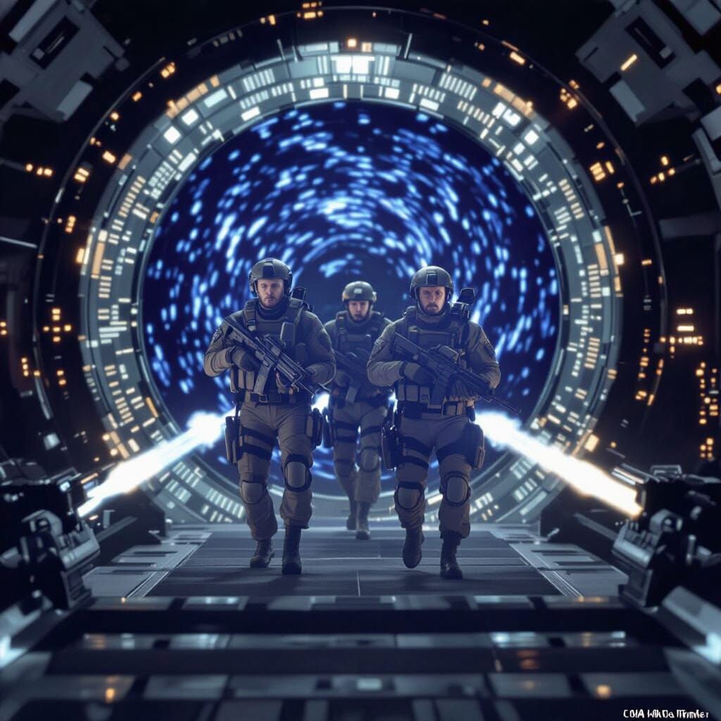 A four-member military unit, CSK-1, stands before a glowing blue alien stargate. Dressed in tactical gear and holding realistic weapons, they face a new mission with determined expressions. Epic sci-fi atmosphere, dramatic lighting, and photorealistic detail.