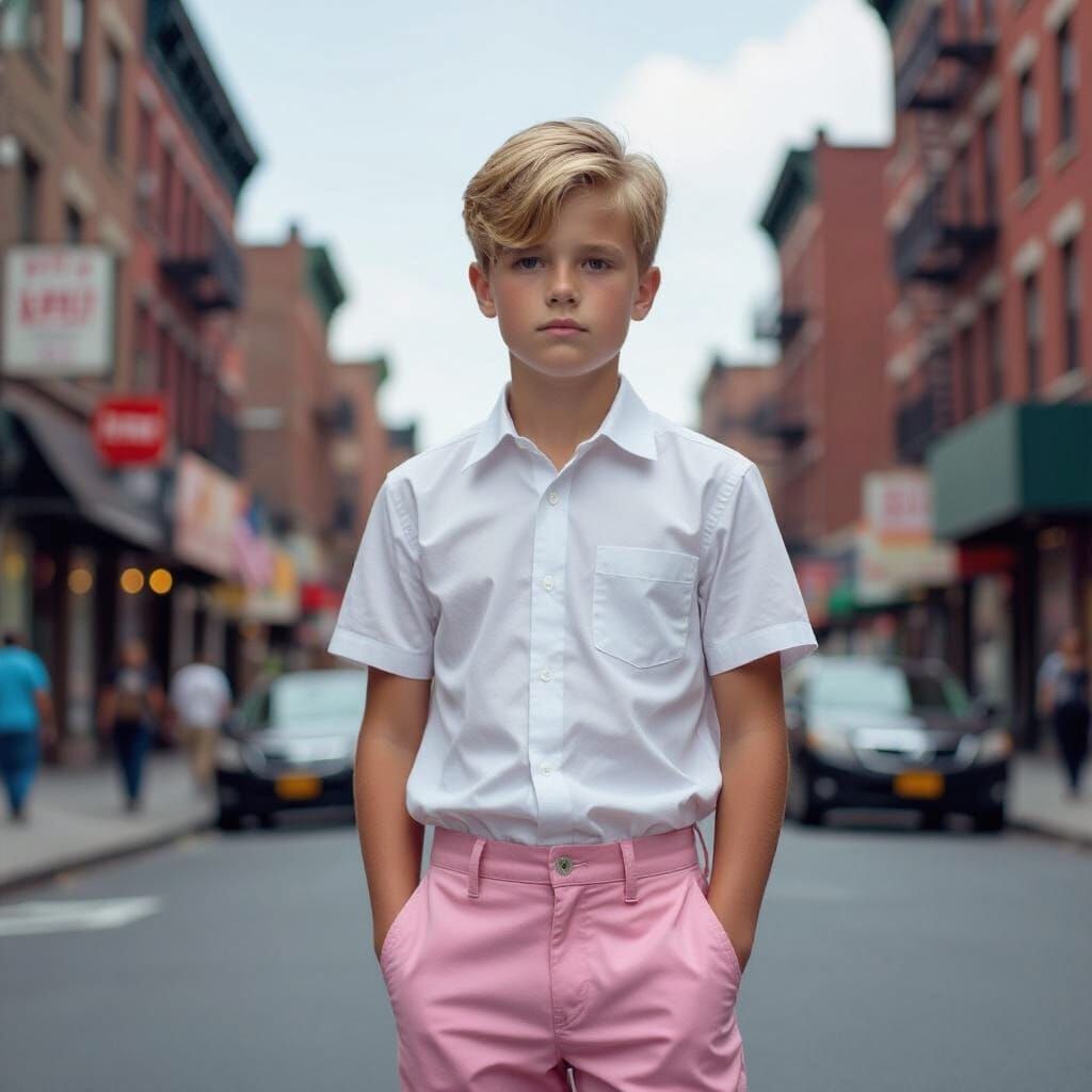 A hyperrealistic image of a blond boy in pink chinos amidst the vibrant energy of Harlem. Features HDR, sharp focus, and moody tones in a cinematic composition.