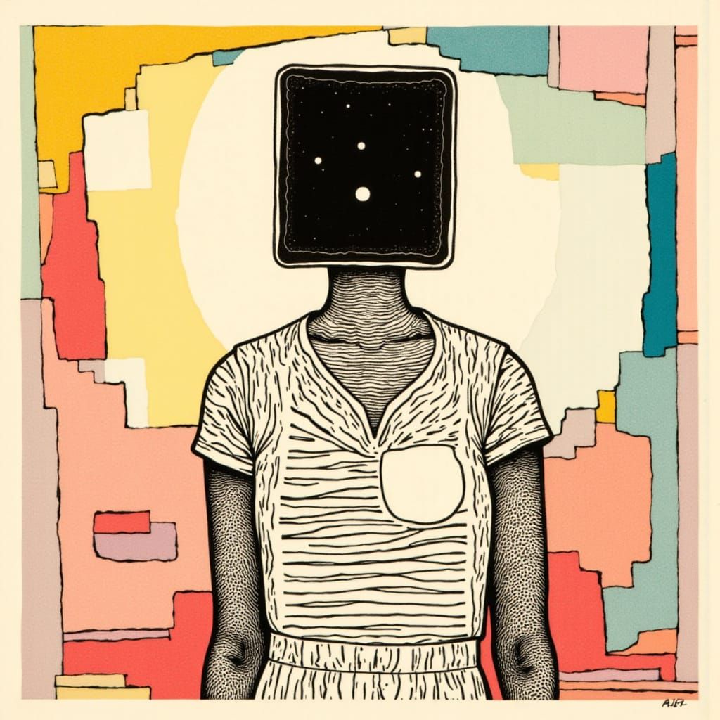 This image presents a minimalist linocut-style line art portrait of an abstract figure. The figure has a pop-tart for a head, set against large negative space. It features vibrant colors, dynamic lighting, and gradients, evoking late summer.