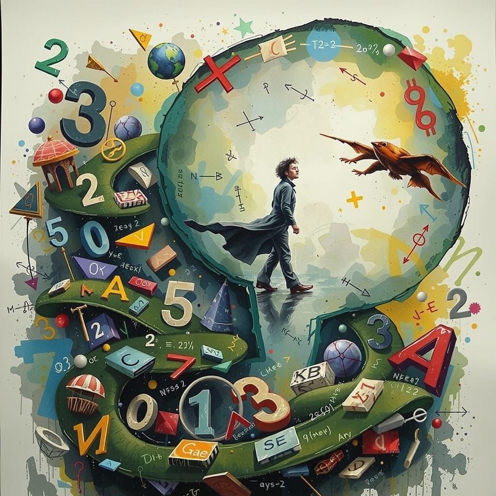 A watercolor painting of a mathematician amidst swirling numbers and symbols. The pop art style evokes bold graphics and whimsical fantasy, presenting equations in joyful chaos with expressive brushstrokes.
