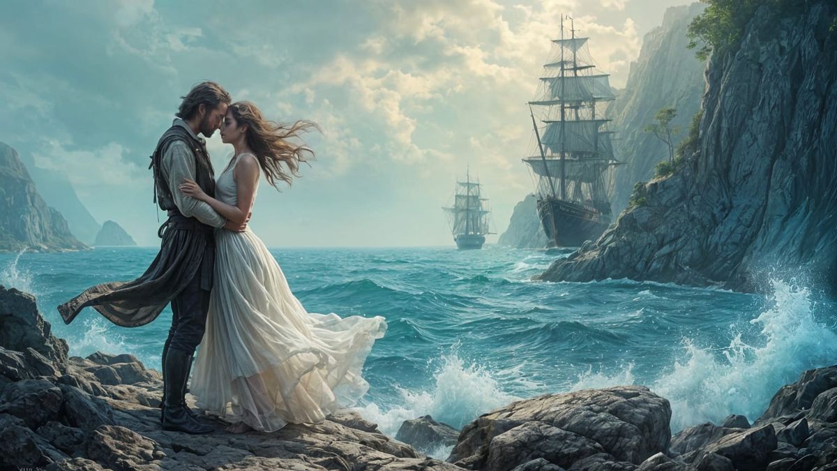 A digital painting depicting a romantic encounter between a pirate and a woman. Evokes themes of adventure and intrigue. The artwork features a vibrant, magical, abstract aesthetic.