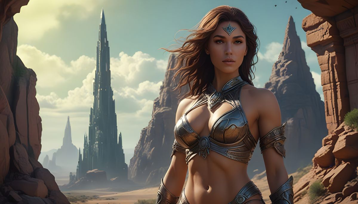 This image shows a stunning cyberpunk warrior princess standing in front of a shrine and obelisk on an alien planet, wearing a skin-tight chainmail bikini and surrounded by vibrant green desert scenery. The artwork features intricate details, dynamic lighting, and a triadic color palette, creating a capt...