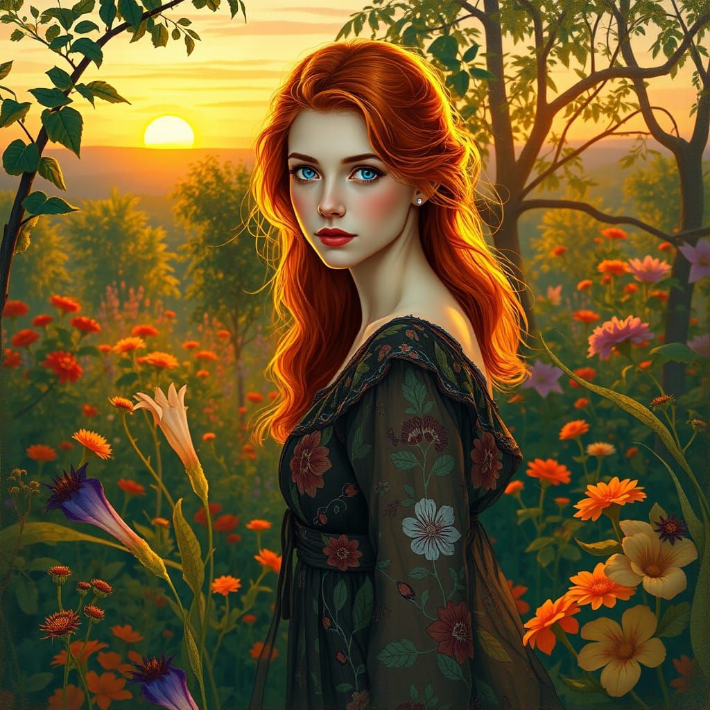 A stunning portrait of a woman with blue eyes and red hair in a garden. This image evokes art nouveau and impressionism with soft lighting and floral accents.
