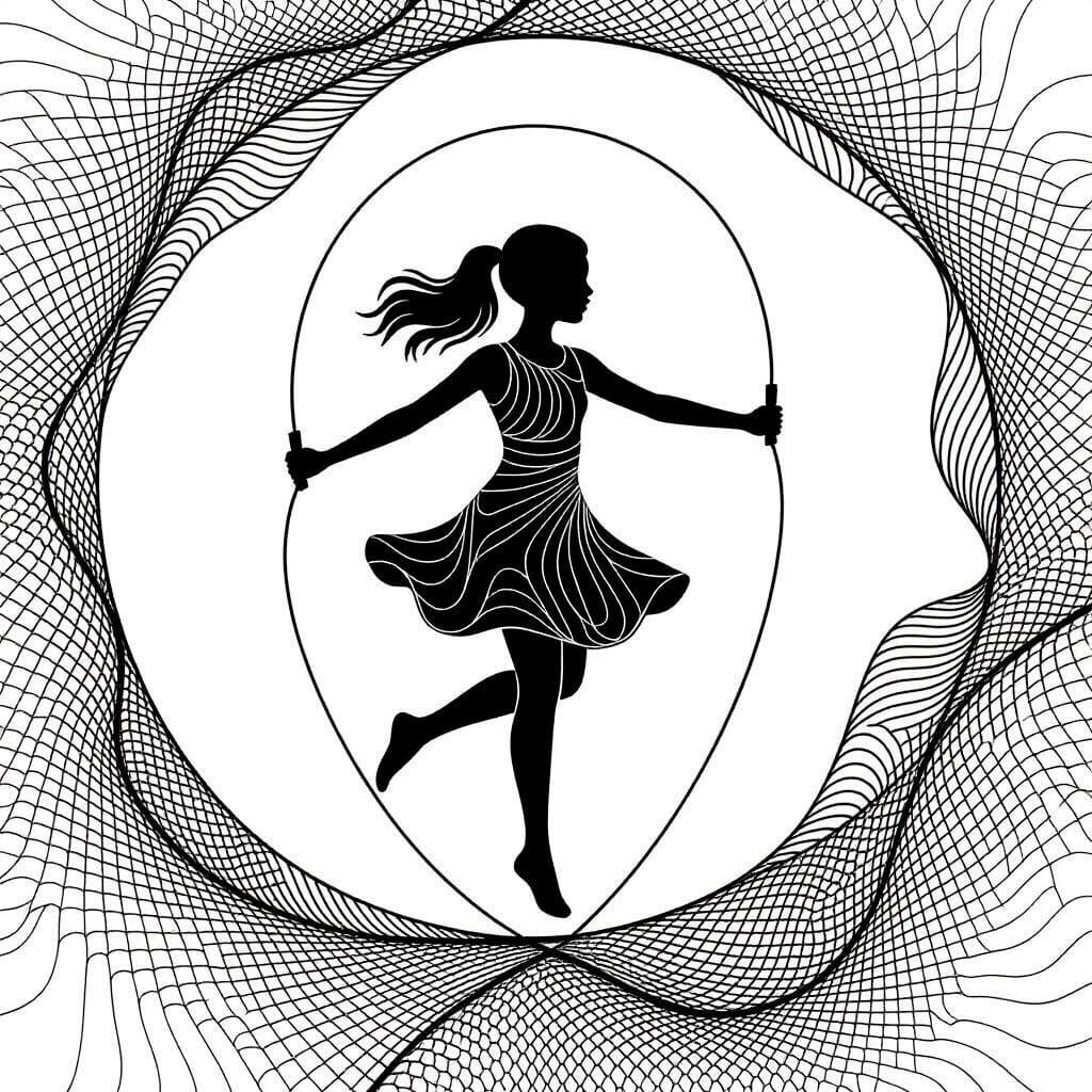 This minimalist line art drawing features a girl jumping rope, created with a single continuous line. Subtle 3D shading adds depth to the abstract, fluid form.