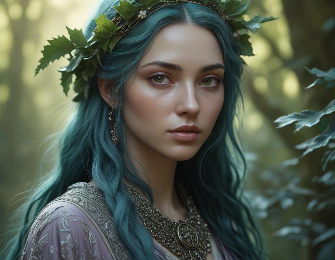 A young girl's portrait blends seamlessly into her natural surroundings, with leaves and vines entwined in her long forest green hair and attire. Soft focus and warm, cool hues create a dreamlike atmosphere, reminiscent of surreal fantasy art.