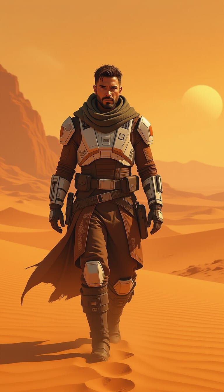 Generate your own unique desert planet concept art, inspired by cinematic film stills. Free and easy to use!