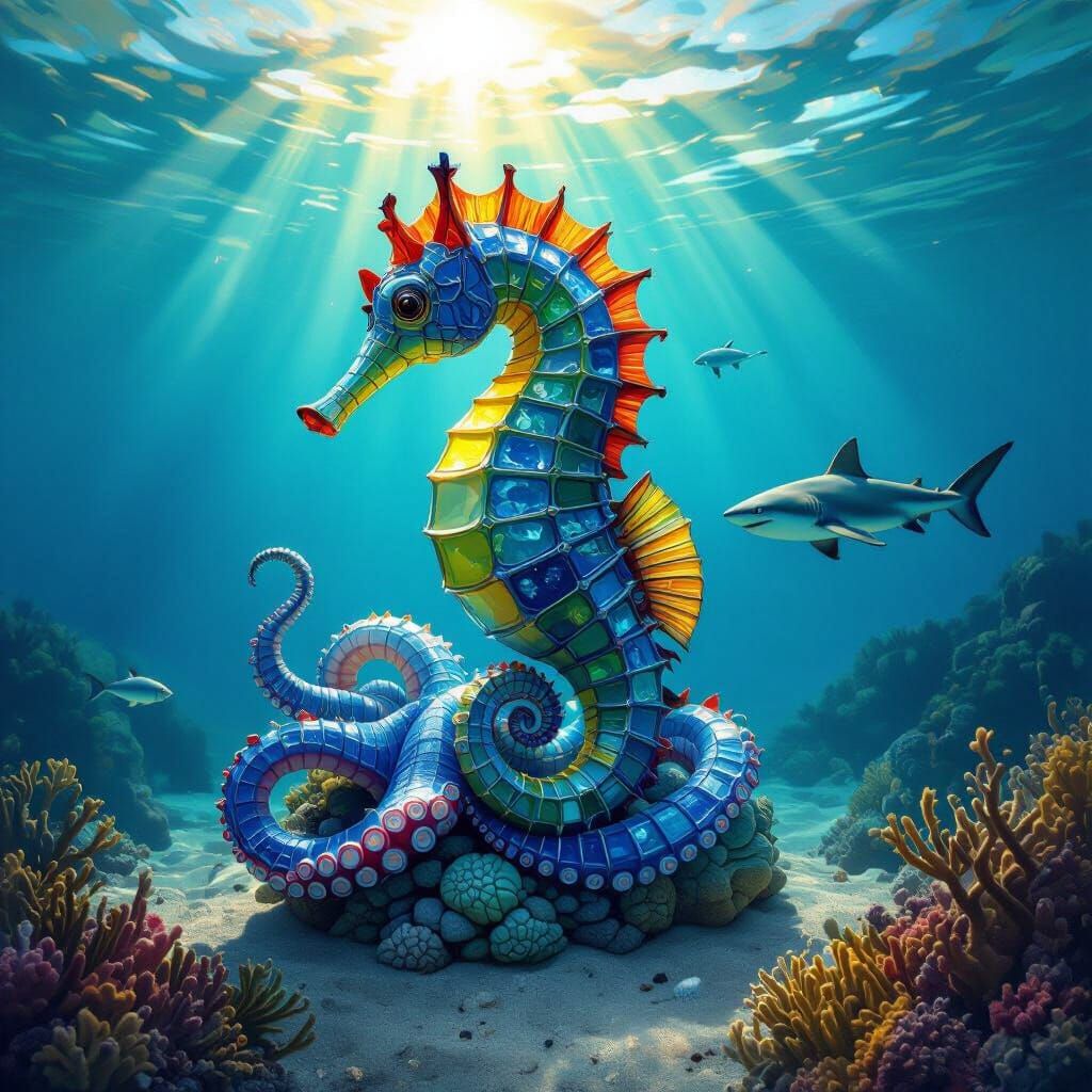 This image shows a hyperrealistic digital painting of a sea glass seahorse sculpture on the ocean floor, illuminated by sunrays. An octopus protects it, with a reef shark nearby. Features vivid colors and dramatic lighting.