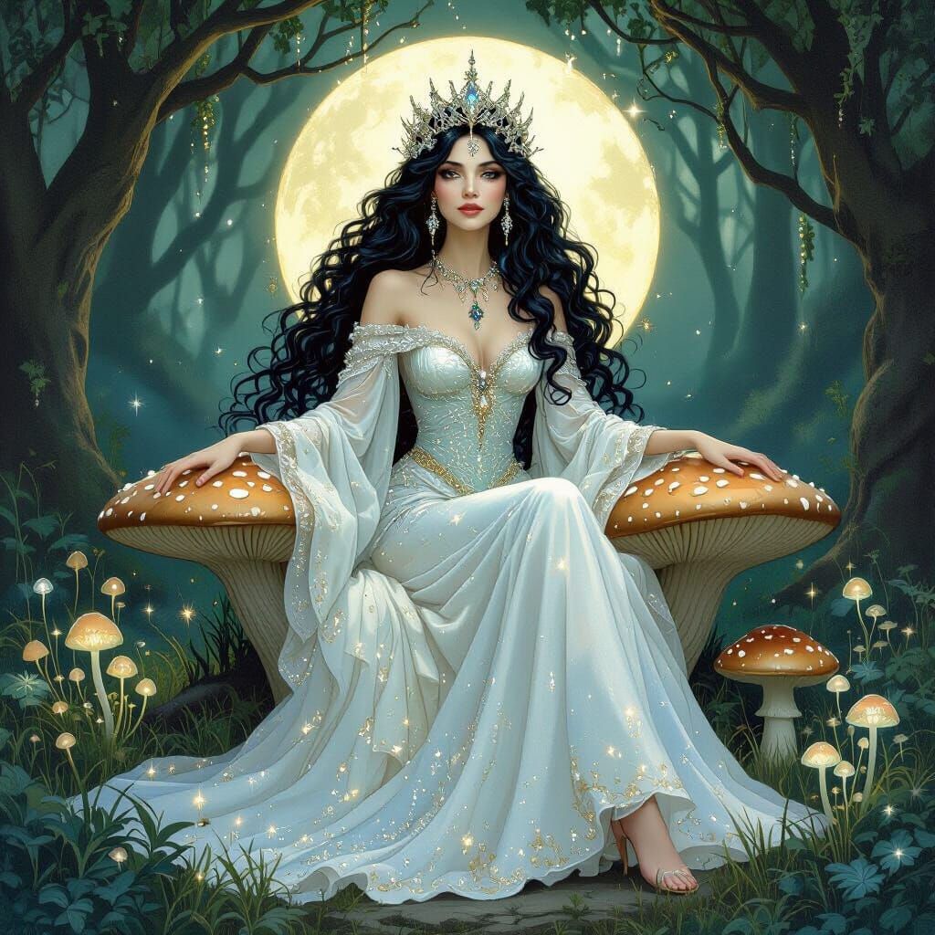 A majestic fairy queen with dark hair sits on a mushroom throne in a magical grove. She wears a gown adorned with moonlight, pearls, and gemstones, illuminated by bioluminescent flora, in an art nouveau style.