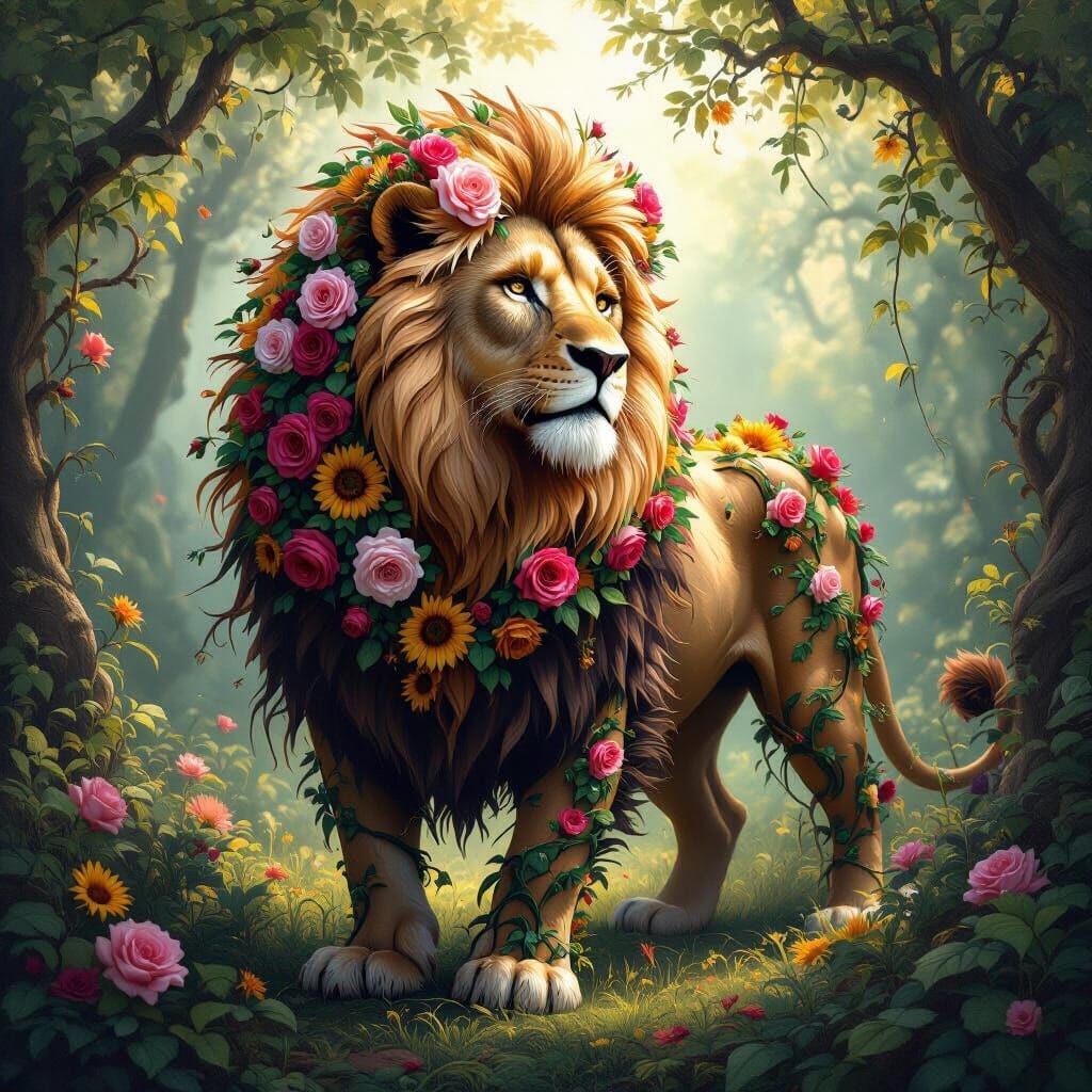 This is a detailed Baroque oil painting of a lion whose mane is made of roses and sunflowers, with a body of vines and leaves, in a magical forest clearing.